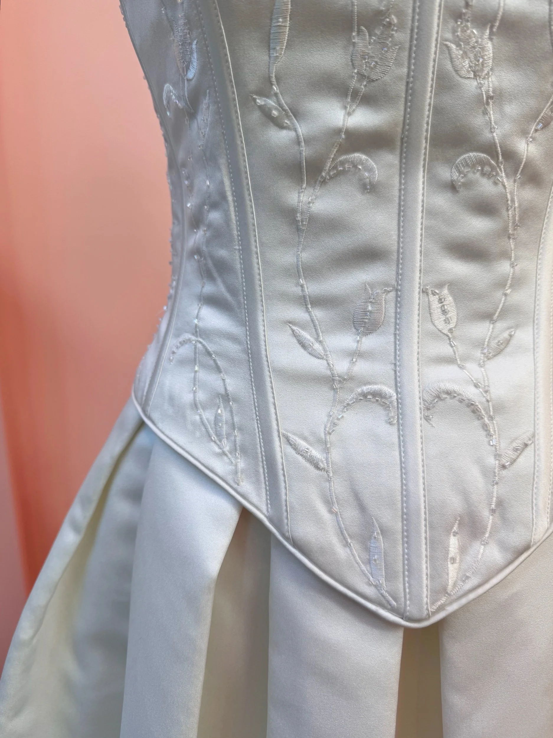 A stunning vintage Mon Cheri wedding gown from the early to mid-1990s, featuring timeless elegance and romantic detailing. This dress showcases a structured satin bodice adorned with floral embroidery and delicate beadwork, flowing into a full satin skirt with a graceful train. The basque waist flatters the figure, while the scoop neckline and sleeveless design give it a refined, classic look.