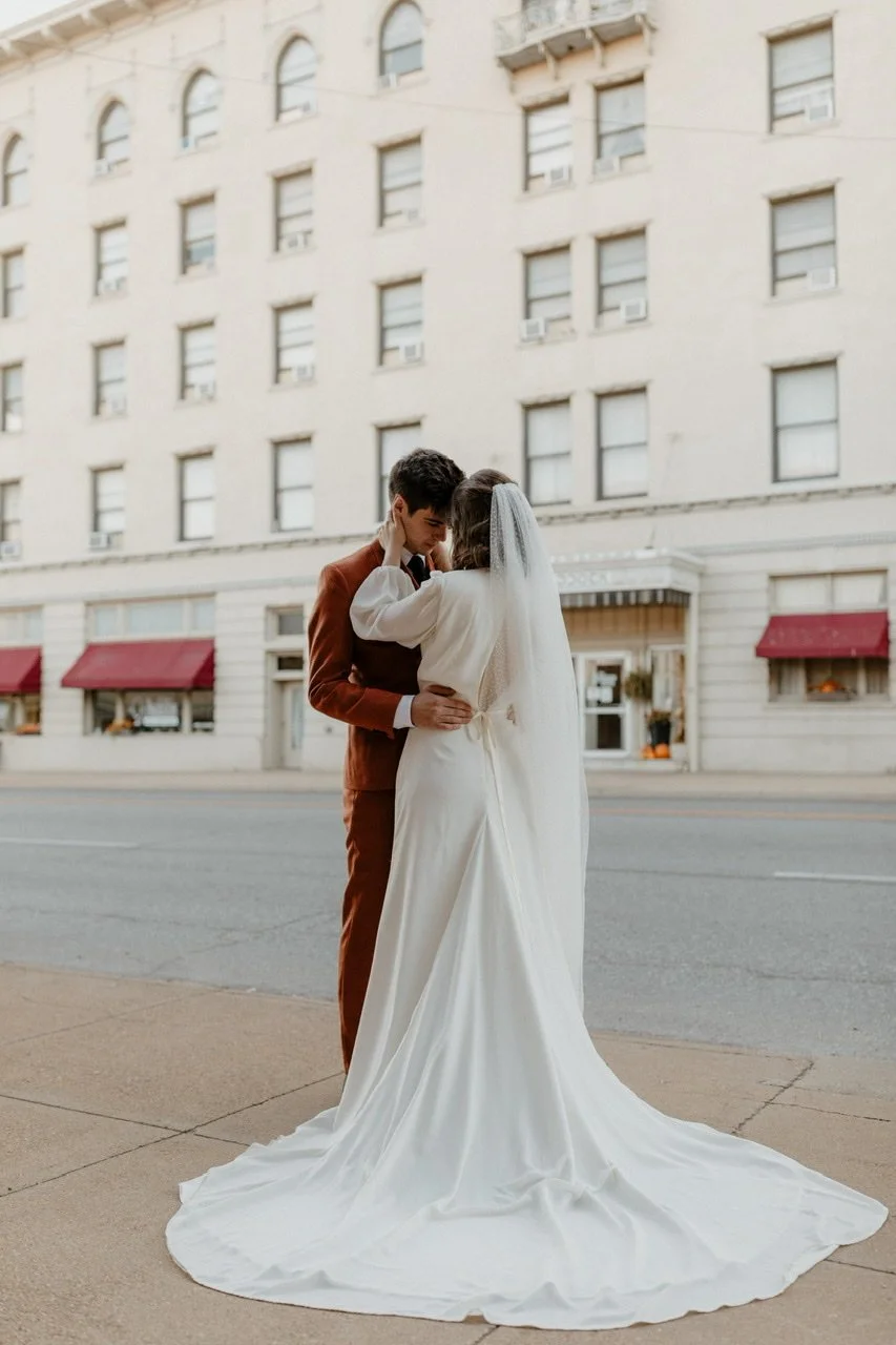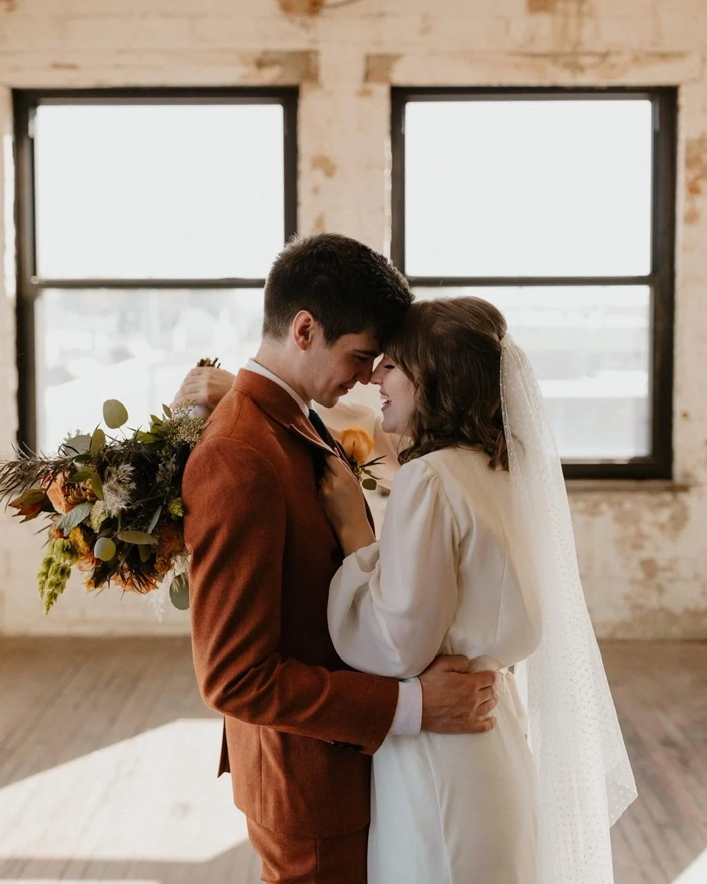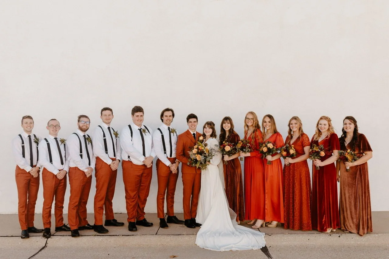 Real bride TressaThis lovely lady chose a 70’s inspired sheath wedding gown with long, billowy sleeves and a romantic sweep train. Her wedding party surrounded her in a variety of burnt amber fabrics, reflective of the couple’s throwback style. Dress: Dunaway by Elizabeth DyePhotographer: Grace Trexel PhotographyVenue: Vintage Venue